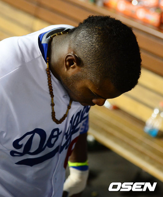 9회말 2사 3루, 다저스 푸이그가 삼진으로 경기가 끝나자 더그아웃에서 아쉬운 표정을 지으며 클럽하우스로 향하고 있다./jpnews@osen.co.kr