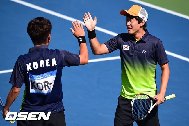 4일 오후 인천 열우물테니스장에서 열린 2014 인천 아시안게임 정구 남자 단체전 한국과 일본의 결승,1경기 복식 김범준-김동훈과 시노하라-고바야시의 경기, 2세트 김동훈이 득점 후 환호하고 있다.