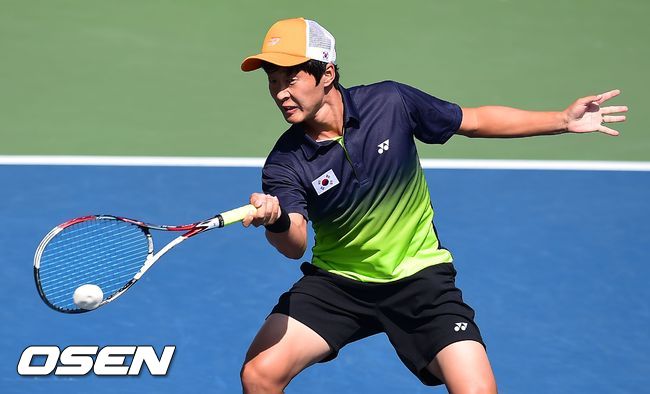 4일 오후 인천 열우물테니스장에서 열린 2014 인천 아시안게임 정구 남자 단체전 한국과 일본의 결승,1경기 복식 김범준-김동훈과 시노하라-고바야시의 경기, 2세트 김동훈이 포핸드를 날리고 있다.