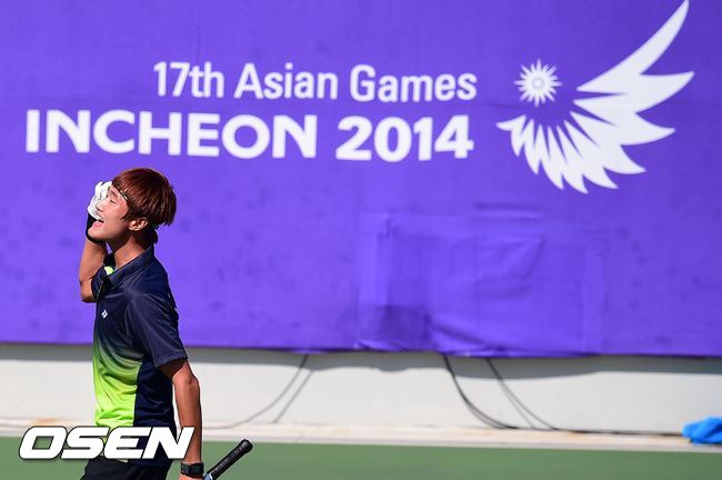 4일 오후 인천 열우물테니스장에서 열린 2014 인천 아시안게임 정구 남자 단체전 한국과 일본의 결승,2경기 단식 김형준이 득점 후 환호하고 있다.