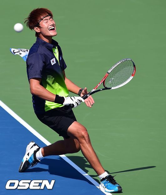 4일 오후 인천 열우물테니스장에서 열린 2014 인천 아시안게임 정구 남자 단체전 한국과 일본의 결승,2경기 단식 김형준이 득점 후 환호하고 있다.