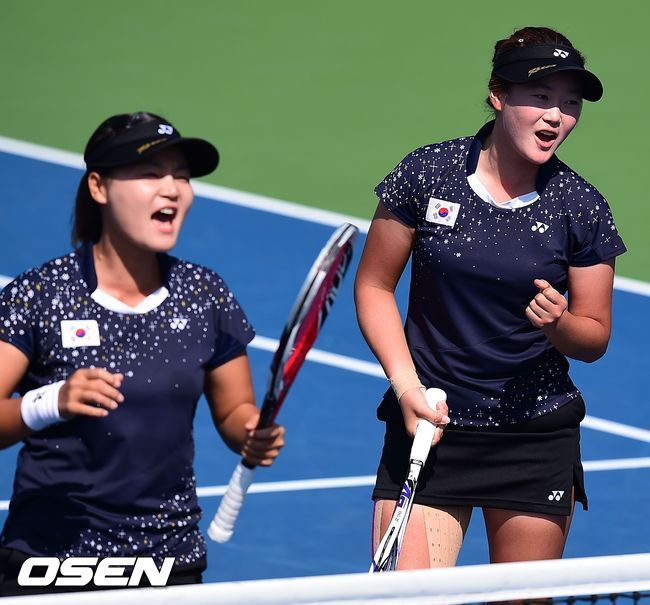 4일 오후 인천 열우물테니스장에서 열린 2014 인천 아시안게임 정구 여자 단체전 한국과 일본의 결승,1경기 복식 주옥과 김지연이 환호하고 있다