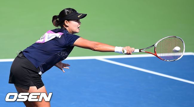 4일 오후 인천 열우물테니스장에서 열린 2014 인천 아시안게임 정구 여자 단체전 한국과 일본의 결승,1경기 복식 주옥이 공을 살려내고 있다
