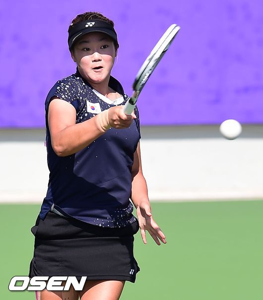 4일 오후 인천 열우물테니스장에서 열린 2014 인천 아시안게임 정구 여자 단체전 한국과 일본의 결승,1경기 복식 김지연이 포핸드를 날리고 있다.