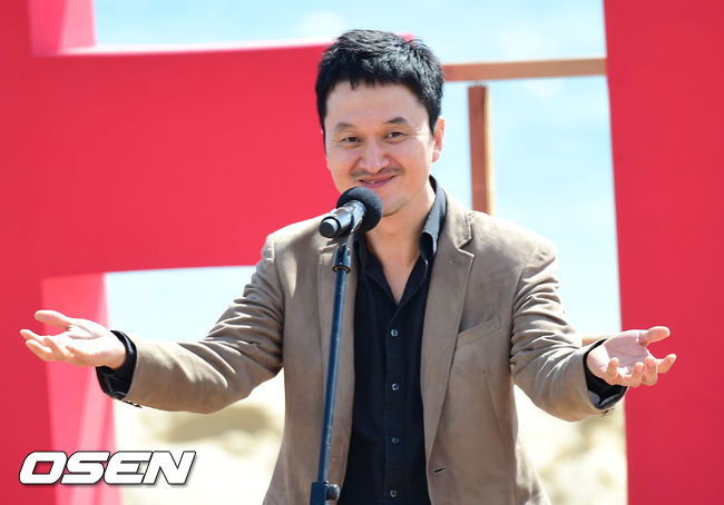 4일 오후 부산광역시 해운대구 중동 해운대 비프빌리지에서 열린 영화 '사랑이 이긴다' 야외무대인사에서 장현성이 관객유도를 하고 있다.