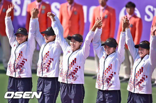 김지연(20, 옥천군청), 주옥(25), 김애경(26, 이상 NH농협은행), 윤수정(25), 김보미(24, 이상 안성시청)로 구성된 여자대표팀도 여자 단체전 결승서 일본을 2-1(5-2, 1-4, 5-2)로 제압하고 금메달을 거머쥐었다.