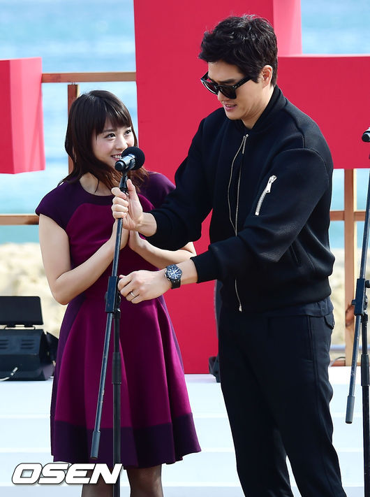 4일 오후 부산광역시 해운대구 중동 해운대 비프빌리지에서 열린 영화 '더 테너-리리코 스핀토' 야외 무대인사에 참석한 유지태가 동료배우 마이크 높이 조절을 해주고 있다.