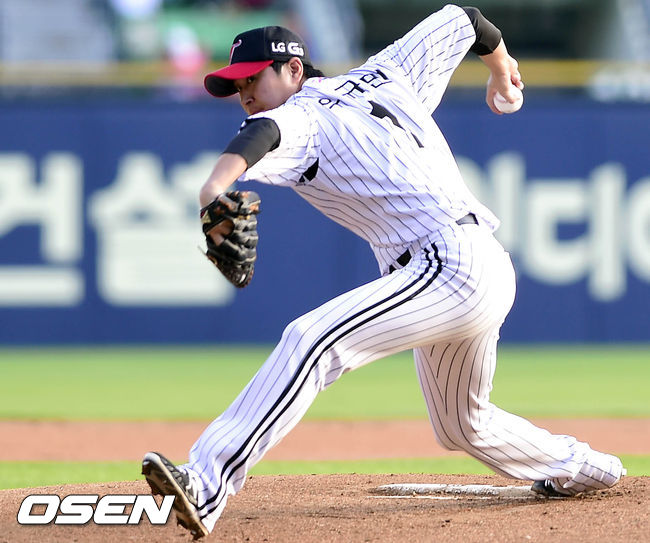 4일 오후 서울 잠실구장에서 열린 '2014 한국야쿠르트 세븐 프로야구 LG 트윈스와 넥센 히어로즈의 경기, LG 선발 투수 우규민이 힘차게 공을 던지고 있다.
