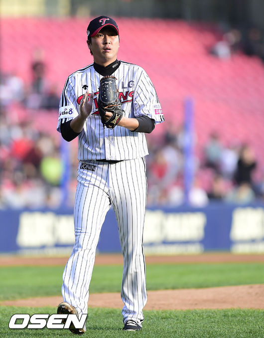 4일 오후 서울 잠실구장에서 열린 '2014 한국야쿠르트 세븐 프로야구 LG 트윈스와 넥센 히어로즈의 경기, LG 선발 투수 우규민이 1회초를 무실점으로 막고 박수를 치고 있다.