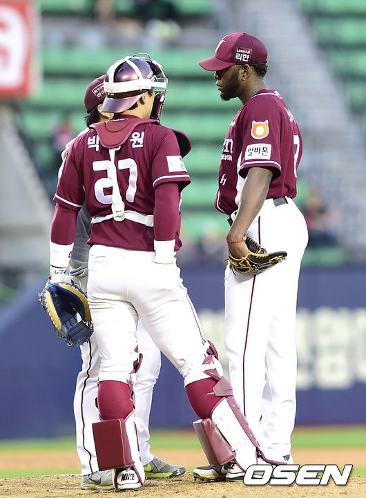 4일 오후 서울 잠실구장에서 열린 '2014 한국야쿠르트 세븐 프로야구 LG 트윈스와 넥센 히어로즈의 경기, 4회말 2사 넥센 소사가 연속 볼넷을 내주자 코치와 박동원이 마운드를 방문하고 있다.