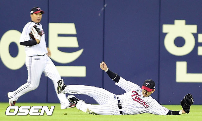 4일 오후 서울 잠실구장에서 열린 '2014 한국야쿠르트 세븐 프로야구 LG 트윈스와 넥센 히어로즈의 경기, 5회초 1사 주자 없는 상황, LG 박용택이 넥센 강정호의 타구를 슬라이딩으로 잡아내고 있다.