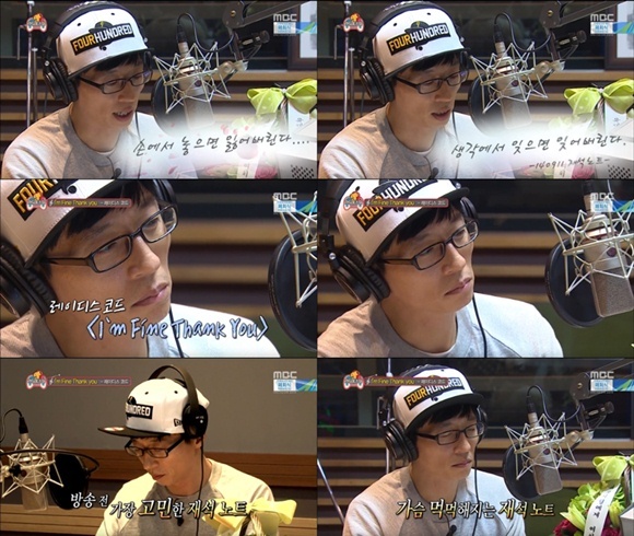 유재석은 "꽃처럼 예쁜 아이들이, 꽃같이 한창 예쁠 나이에 꽃잎처럼 날아갔다. 손에서 놓으면 잃어버린다. 생각에서 잊으면 잊어버린다"는 메시지와 함께 레이디스코드의 '아임 파인 땡큐'를 선곡해 감동을 자아냈다.