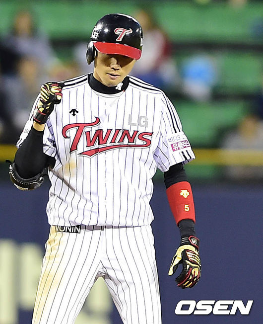 4일 오후 서울 잠실구장에서 열린 '2014 한국야쿠르트 세븐 프로야구 LG 트윈스와 넥센 히어로즈의 경기, 5회말 1사 주자 1루, LG 김용의가 2루타를 치고 기뻐하고 있다.
