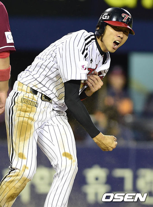 4일 오후 서울 잠실구장에서 열린 '2014 한국야쿠르트 세븐 프로야구 LG 트윈스와 넥센 히어로즈의 경기, 5회말 1사 주자 2,3루 LG 박용택의 안타에 3루를 밟고 넥센 이택근의 3루 송구 실책으로 홈을 밟은뒤 기뻐하고 있다.