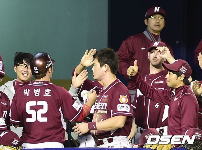 4일 오후 서울 잠실구장에서 열린 '2014 한국야쿠르트 세븐 프로야구 LG 트윈스와 넥센 히어로즈의 경기, 7회초 1사 주자 2루, 넥센 김민성의 안타에 박병호가 홈을 밟고 선수들과 기쁨을 나누고 있다.