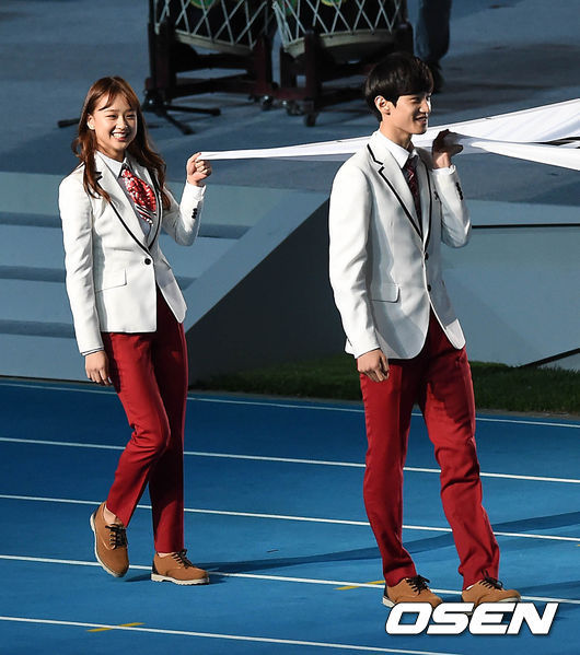 남자 축구 금메달의 결승골 주인공인 임창우(22, 대전 시티즌)와 한국 리듬체조 사상 처음으로 아시안게임 금메달을 따낸 손연재(20, 연세대) 등 8명이 2014 인천아시안게임 폐막식서 한국 선수단의 기수로 나서 관중들의 우레와 같은 박수를 받았다. 이들은 대형 태극기를 함께 들고 등장해 팬들의 열띤 호응을 이끌어냈다.