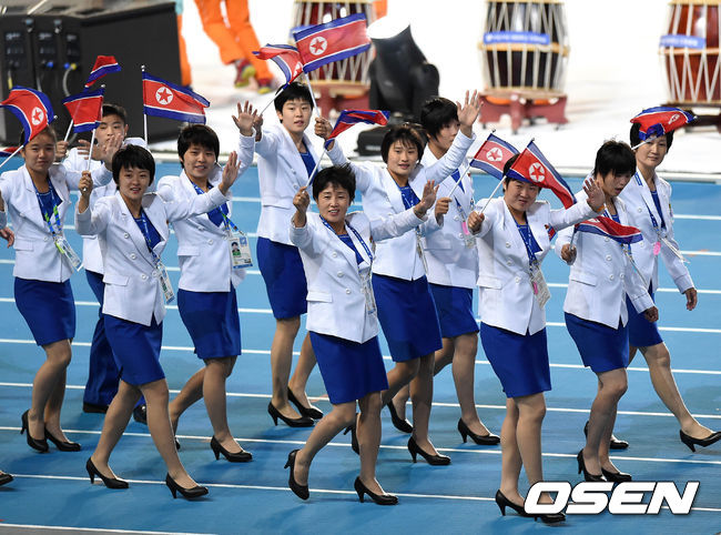 북한 선수단이 국기를 흔들며 경기장을 입장하고 있다.