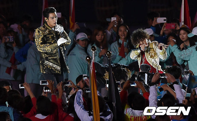 그룹 빅뱅 지드래곤과 탑이 축하공연을 펼치고 있다.