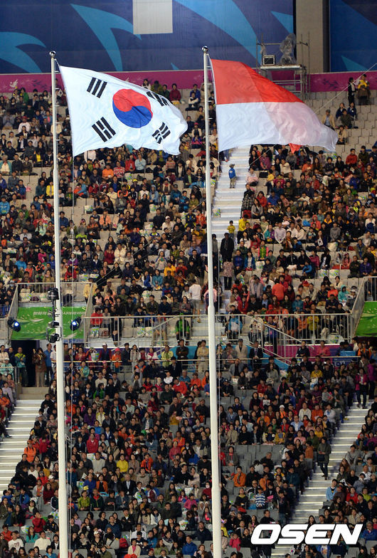 개최국 국기입장 순서에는 이번 대회 메달 리스트들인 임창우(22, 축구), 이대훈(22, 태권도), 여호수아(27, 육상), 조호성(40, 사이클), 손연재(20, 리듬체조), 이나영(28, 볼링), 이특영(25, 양궁), 김민지(25, 사격) 등 8명이 대형 태극기를 들고 입장해 경기장을 찾은 팬들의 박수갈채를 받았다. 임창우는 남자 축구 북한과 결승서 천금 결승골을 터트리며 대표팀에 28년 만에 금메달을 안긴 주인공이다. 손연재는 한국 리듬체조 사상 처음으로 개인종합 금메달을 거머쥐었다. 단체전서 은메달도 추가했다. 이대훈(남자 2연패), 여호수아(남자 1600m 릴레이 은메달, 200m 동메달), 조호성(남자 옴니엄 은메달), 이나영(4관왕, 은 1, 동 1개 추가), 이특영(리커브 여자 단체전 금메달), 김민지(여자 스키트 개인전 금메달, 단체전 은메달) 등도 대형 태극기를 들고 입장하며 열띤 호응을 이끌어냈다. 이어진 45개국 선수단이 입장할 땐 개막식과 마찬가지로 축제의 무대였다.