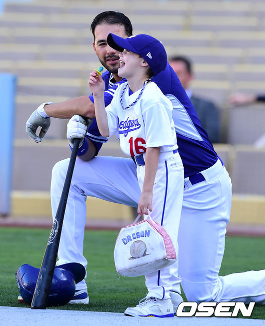 경기에 앞서 다저스 이디어가 훈련을 하며 아들과 이야기를 나누고 있다.