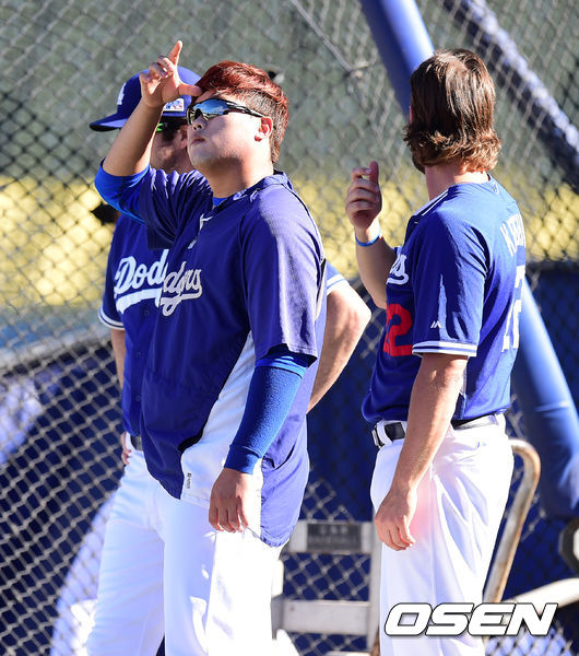 경기에 앞서 다저스 류현진이 타격 훈련을 하며 땀을 닦고 있다.