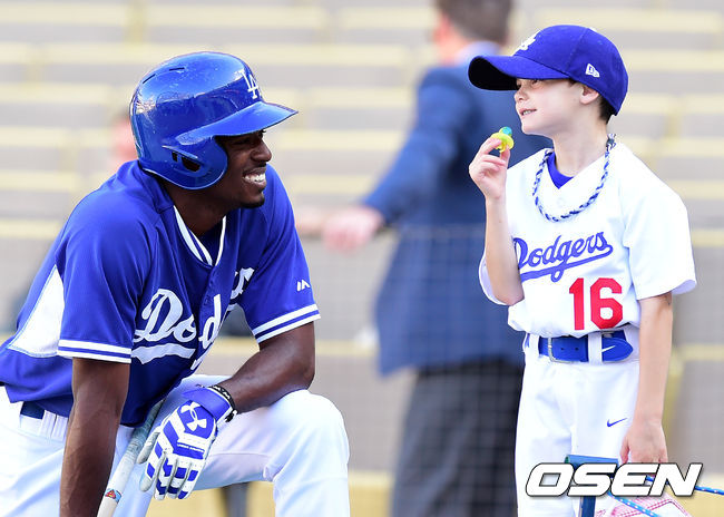 경기에 앞서 다저스 고든이 이디어 아들을 바라보며 미소짓고 있다.