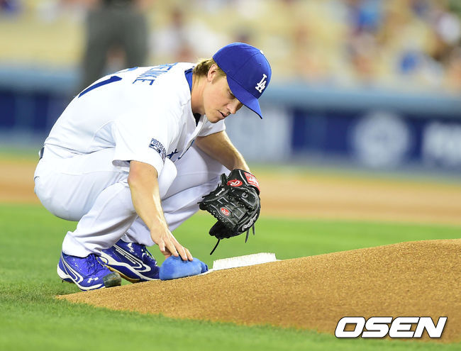 투구에 앞서 선발 그레인키가 로진팩을 만지고 있다.