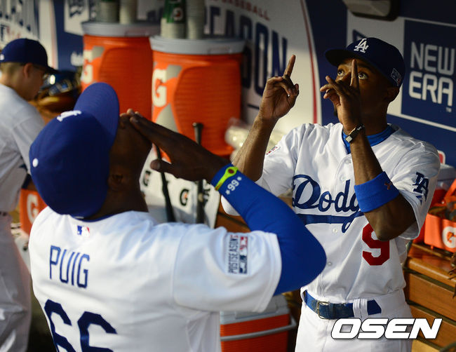 경기에 앞서 고든과 푸이그가 승리기원을 하고 있다.