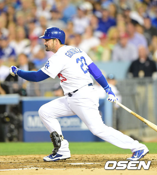 3회말 2사 2,3루 곤잘레스 선취 2타점 적시타를 날리고 있다.