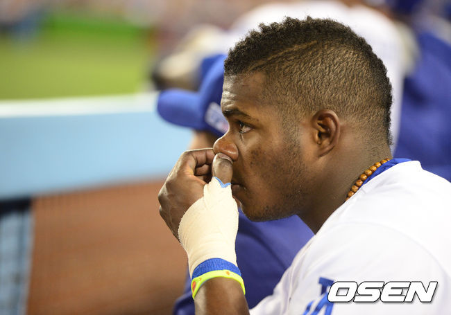 두번째 타석에서 삼진아웃을 당한 푸이그가 덕아웃에서 경기를 관전하고 있다.