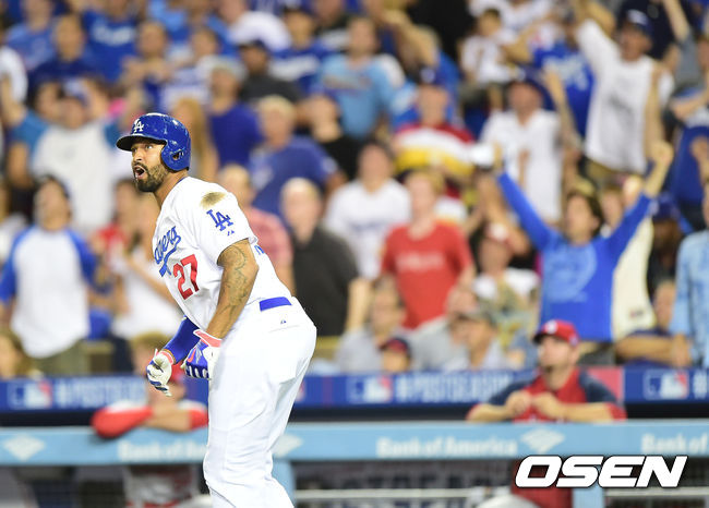 8회말 선두타자 맷 켐프가 솔로 홈런을 날리고 자신의 타구를 바라보고 있다.