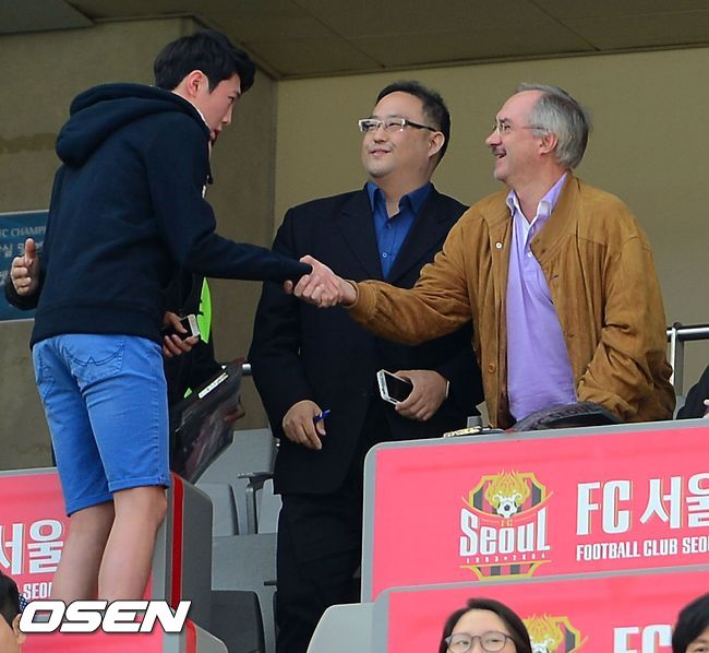 5일 서울 상암동 서울월드컵경기장에서 열린 '현대오일뱅크 K리그 클래식 2014' FC서울과 수원 삼성의 경기에 앞서 슈틸리케 대표팀 감독이 지인과 인사를 하고 있다