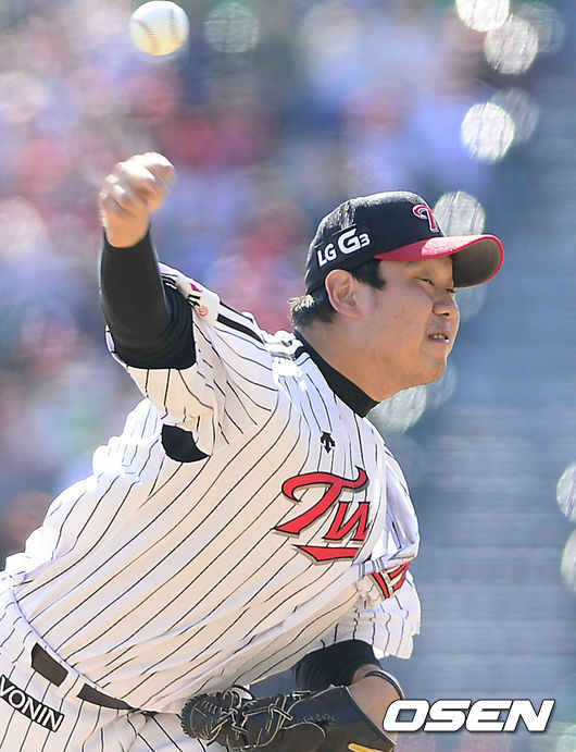 5일 오후 서울 잠실구장에서 열린 '2014 한국야쿠르트 세븐 프로야구 LG 트윈스와 넥센 히어로즈의 경기, 1회초 LG 선발 투수 류제국이 힘차게 공을 던지고 있다.