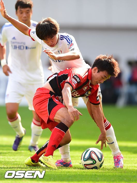 5일 서울 상암동 서울월드컵경기장에서 열린 '현대오일뱅크 K리그 클래식 2014' FC서울과 수원 삼성의 경기, 전번 FC서울 고요한과 수원 권창훈이 몸싸움을 펼치고 있다.