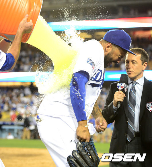 경기후 다저스 맷 켐프가 히어로 인터뷰 도중 물세례를 받고 있다. /jpnews@osen.co.kr. /jpnews@osen.co.kr