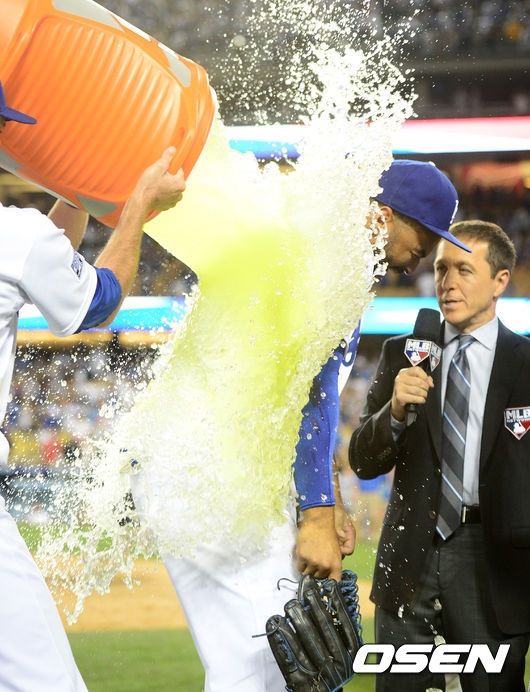 맷 켐프 축하 물세례, 男아나운서 '나는 어쩌지?'