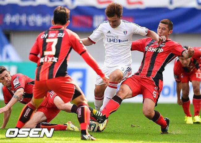 5일 서울 상암동 서울월드컵경기장에서 열린 '현대오일뱅크 K리그 클래식 2014' FC서울과 수원 삼성의 경기, 전반 FC서울 차두리가 수원 김은선의 공을 태클로 빼앗고 있다