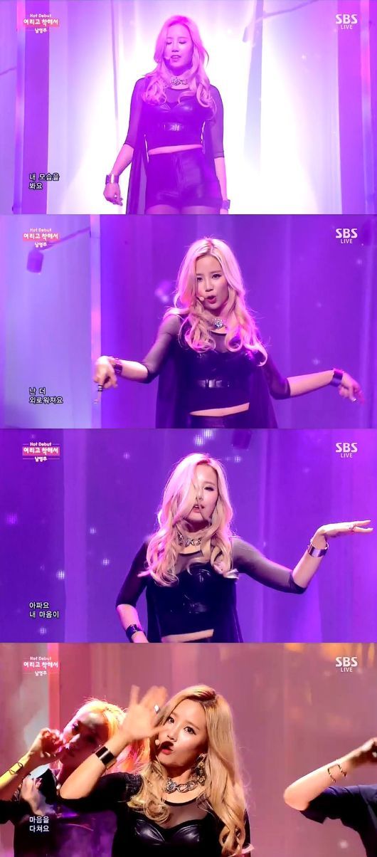 이날 남영주는 파격적인 금발머리와 날씬한 몸매가 고스란히 드러나는 타이트한 블랙 의상을 입고 등장했다. 그는 몸을 쓸어내리는 듯한 안무와 속삭이는 듯한 보이스의 야릇한 매력으로 눈길을 끌었다.