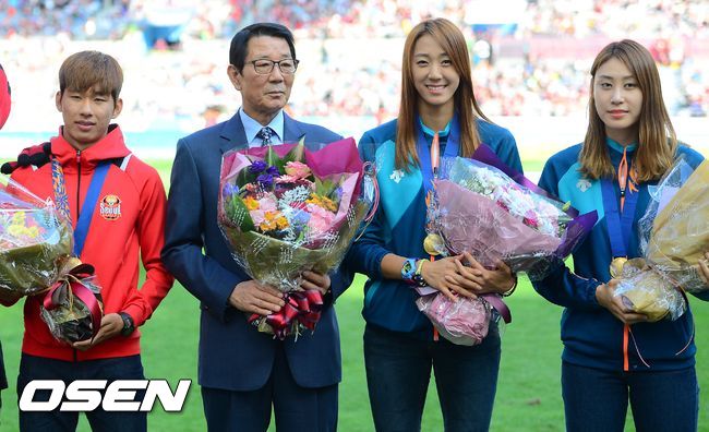 5일 서울 상암동 서울월드컵경기장에서 열린 '현대오일뱅크 K리그 클래식 2014' FC서울과 수원 삼성의 경기, 하프타임때 윤일록과 GS칼텍스 이선구 감독, 한송이, 배유나가 아시안게임 금메달 꽃다발 전달식에서 포즈를 취하고 있다