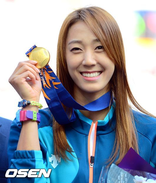 5일 서울 상암동 서울월드컵경기장에서 열린 '현대오일뱅크 K리그 클래식 2014' FC서울과 수원 삼성의 경기, 하프타임때 윤일록과 GS칼텍스 이선구 감독, 한송이, 배유나가 아시안게임 금메달 꽃다발 전달식에서 포즈를 취하고 있다