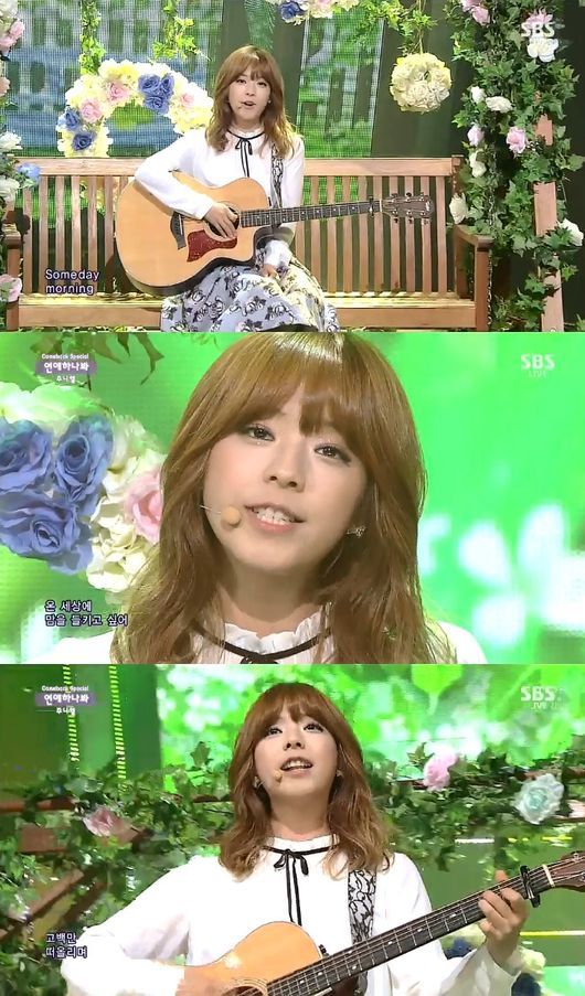 주니엘은 5일 오후 방송된 SBS '생방송 인기가요'에서 신곡 '연애하나봐'의 무대를 선보였다.
