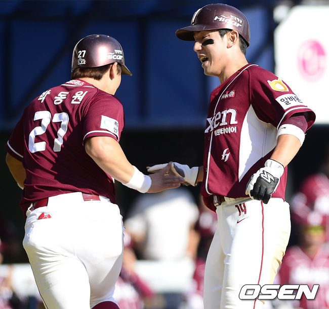 5일 오후 서울 잠실구장에서 열린 '2014 한국야쿠르트 세븐 프로야구 LG 트윈스와 넥센 히어로즈의 경기, 5회초 1사 주자 2,3루, 넥센 이택근의 안타에 홈을 밟은 박동원과 서건창이 기쁨을 나누고 있다.