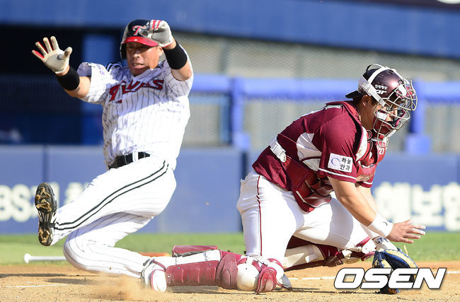 5일 오후 서울 잠실구장에서 열린 '2014 한국야쿠르트 세븐 프로야구 LG 트윈스와 넥센 히어로즈의 경기, 5회말 1사 주자 2,3루 LG 최승준의 2타점 적시 안타에 2루주자 이병규가 홈으로 슬라이딩하고 있다.