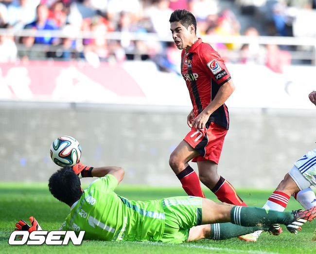 5일 서울 상암동 서울월드컵경기장에서 열린 '현대오일뱅크 K리그 클래식 2014' FC서울과 수원 삼성의 경기, 후반 FC서울 몰리나가 수원 정성룡 골키퍼의 선방에 막혀 골찬스를 놓치고 있다