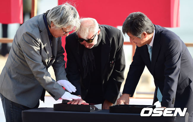 벨라 타르 감독(왼쪽)이 5일 오후 부산 해운대구 중1동 해운대해수욕장 비프빌리지에서 열린 핸드프린팅 행사에 참석해 핸드프린팅을 하고 있다.
