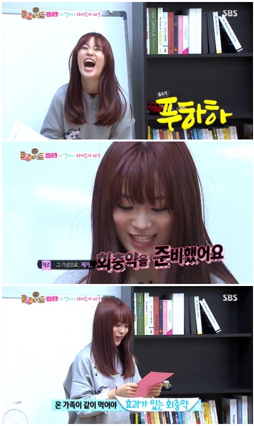 허영지는 5일 오후 방송된 SBS 예능프로그램 '일요일이 좋다-룸메이트2'에서 "가족이 된 기념으로 선물을 준비했다"며 회충약을 꺼냈다.
