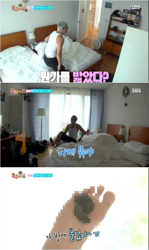 박준형은 5일 오후 방송된 SBS 예능프로그램 '일요일이 좋다-룸메이트2'에서 침대 밖을 나서자 마자 강아지 오이의 변을 밟았다.