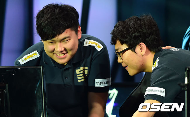 중국 팀들끼리의 대결로 관심을 모았던 롤드컵 8강 3번째 경기의 승자는 코리안 듀오가 활약하고 있는 로얄클럽이었다. 로얄클럽이 원딜 '우지' 지안 쯔하오가 해결사 역할을 톡톡히 하면서 롤드컵 4강행에 성공했다. 로얄클럽은 5일 부산 벡스코 오디토리엄에서 열린 '2014 LOL 월드챔피언십(이하 롤드컵)' 8강 3경기 EDG와 경기서 지안 쯔하오를 중심으로 똘똘 뭉치면서 맞수 EDG를 풀세트 접전 끝에 3-2로 제압하면서 롤드컵 4강행 티켓을 거머쥐었다. 승리를 거둔 인섹 최인석과 제로 윤경섭이 기뻐하고 있다. / youngrae@osen.co.kr