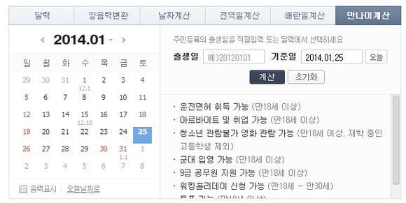 한 포털 사이트에서는 만 나이 계산의 불편함을 위해 '만 나이 계산기' 서비스를 제공하고 있다. '만 나이 계산기'를 이용하면 운전면허 취득, 아르바이트 및 취업, 청소년 관람불가 영화 관람, 군대 입영, 9급 공무원 지원, 워킹홀리데이 신청, 투표 가능 나이 등을 알 수 있다.
