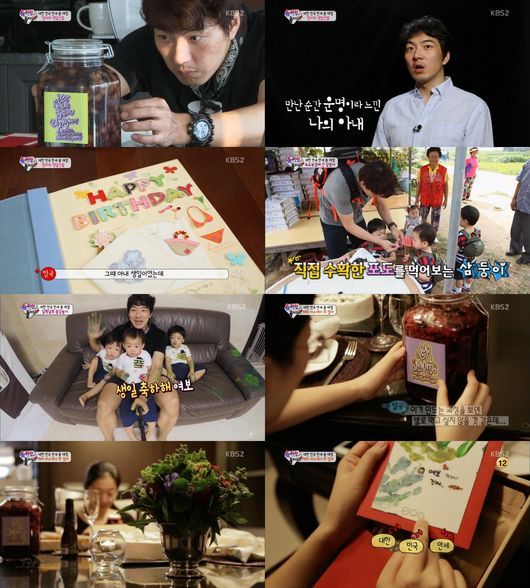 5일 방송된 KBS 2TV ‘해피선데이-슈퍼맨이 돌아왔다’(이하 슈퍼맨)에서는 송일국이 아내의 생일을 맞아 선물을 준비하기 위해 삼둥이와 포도농장을 방문해 포도주스를 만들고 카드를 만드는 내용이 전파를 탔다.